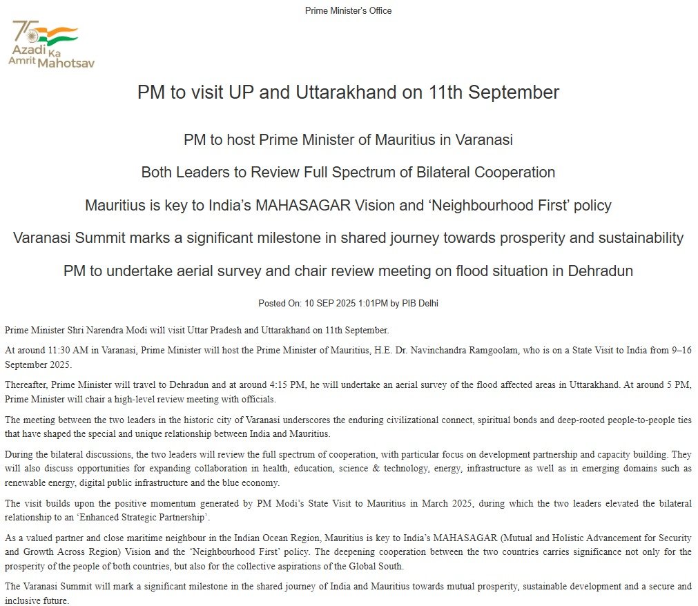 प्रधानमंत्री मोदी वाराणसी में लगभग 11:30 बजे मॉरीशस के प्रधानमंत्री डॉ. नवीनचंद्र रामगुलाम की मेजबानी करेंगे जो 9 से 16 सितंबर 2025 तक भारत की राजकीय यात्रा पर हैं।
